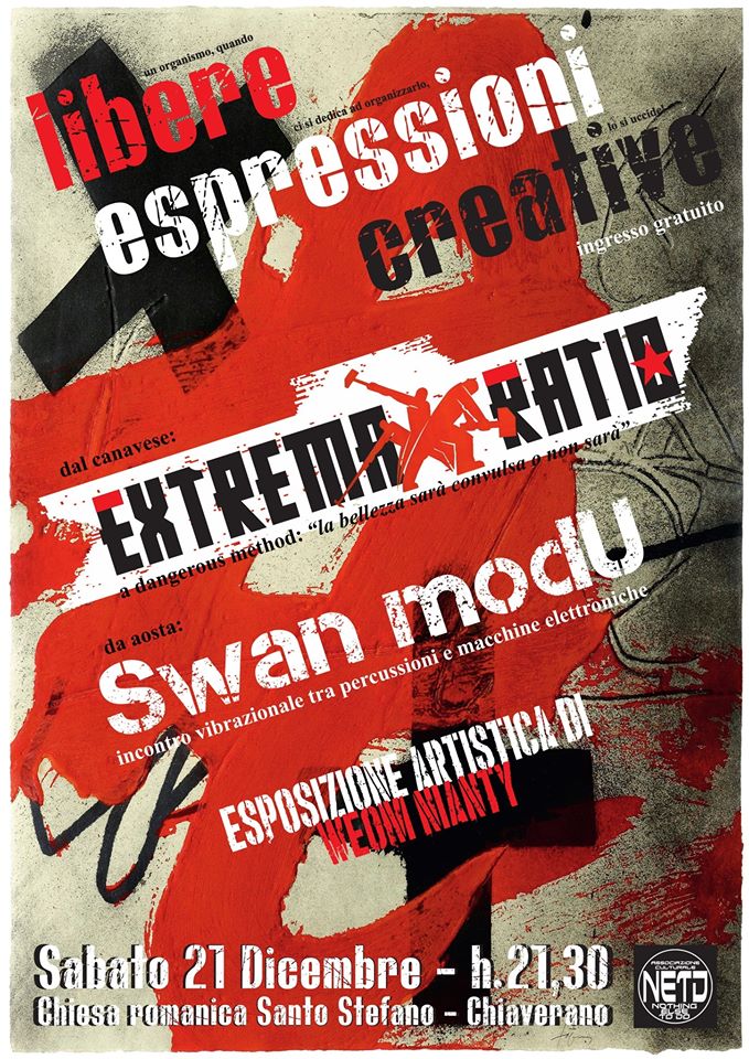 Concerto alla Chiesa di Santo Stefano di Sessano a Chiaverano: Extrema Ratio (a dangerous method dal Canavese) e Swan Modu (incontro vibrazionale tra percussioni e macchine elettroniche da Aosta). Durante la serata sarà presente la mostra di Weomnianty (assemblaggi pittorici disfunzionali dal Canavese). Organizzato da Nothing Else To Do