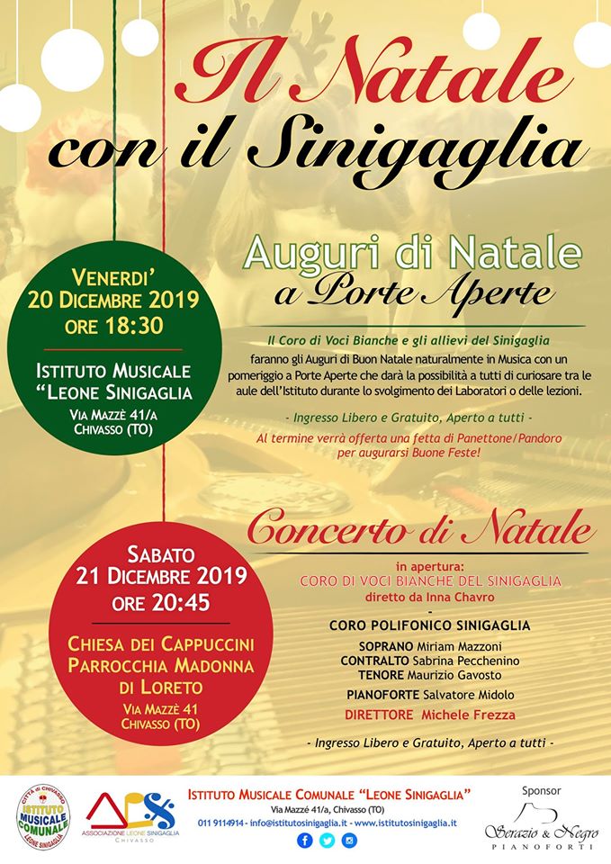 Due serate in compagnia dell’Istituto Musicale Comunale Leone Sinigaglia: venerdì 20 dicembre Natale a Porte Aperte con il coro di Voci Bianche e Sabato 21 dicembre Concerto di natale presso la Chiesa dei Cappuccini