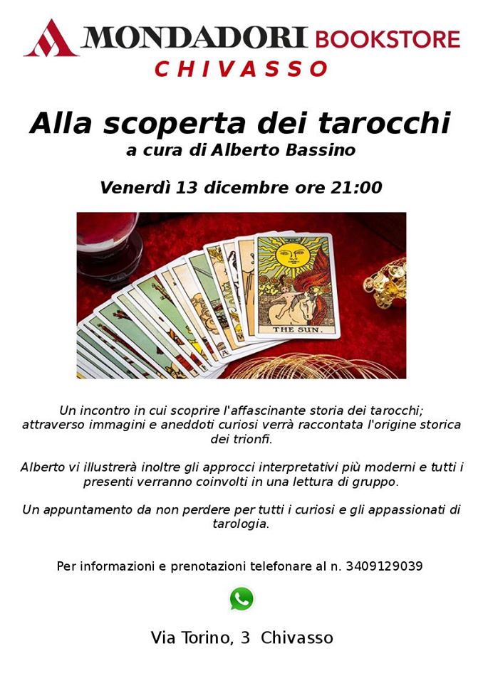 Al Mondadori Bookstore di Chivasso, un incontro per scoprire l’affascinante storia dei tarocchi; attraverso immagini e aneddoti curiosi verrà raccontata l’origine storica dei trionfi. Alberto Bassino vi illustrerà inoltre gli approcci interpretativi più moderni e tutti i presenti verranno coinvolti in una lettura di gruppo